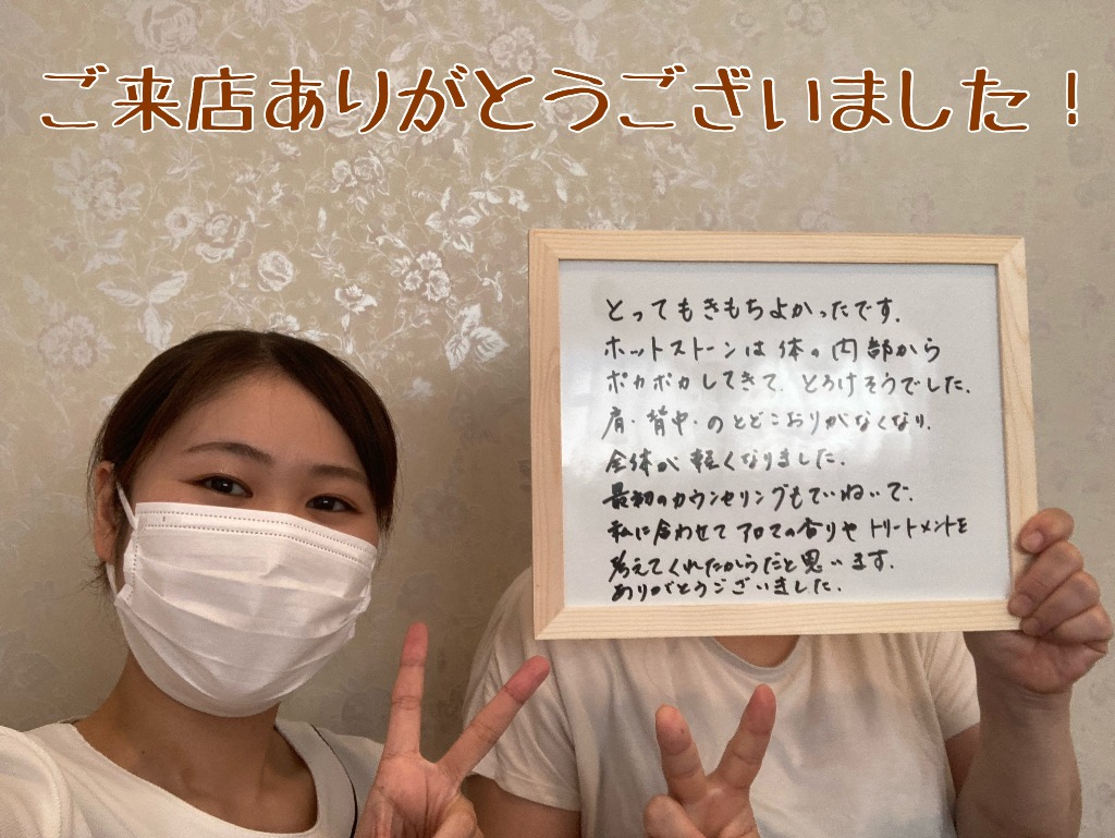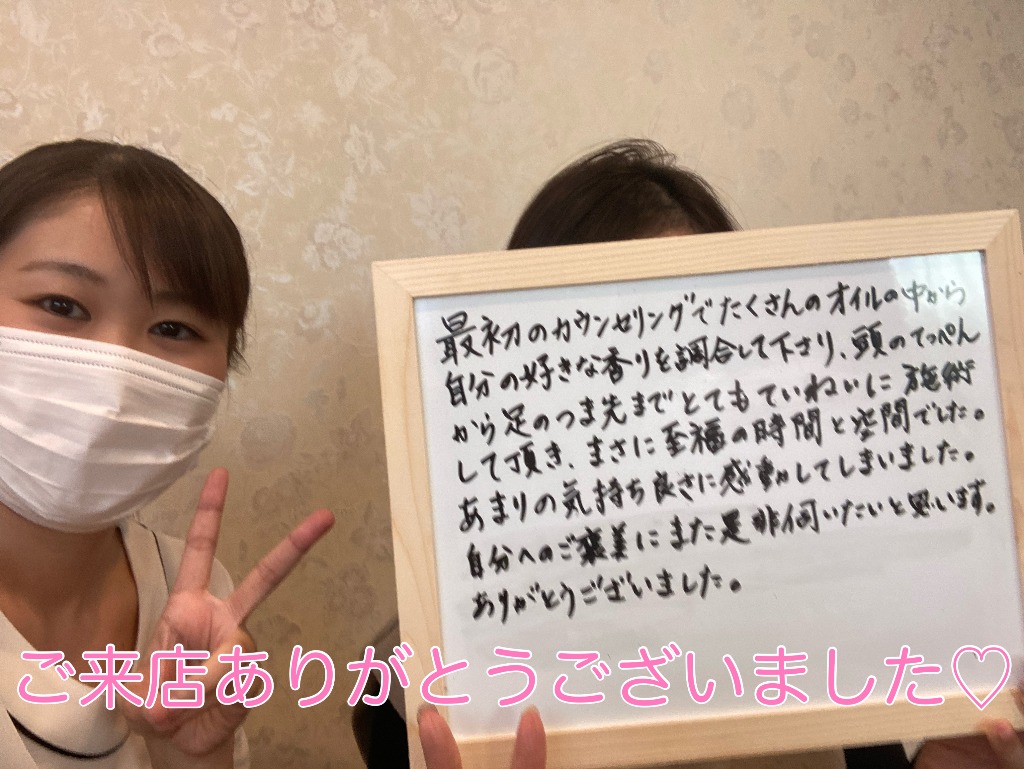最初のカウンセリングも丁寧で、私に合わせてアロマの香りやトリートメントを考えてくれたからだと思います。ありがとうございました。(40代)