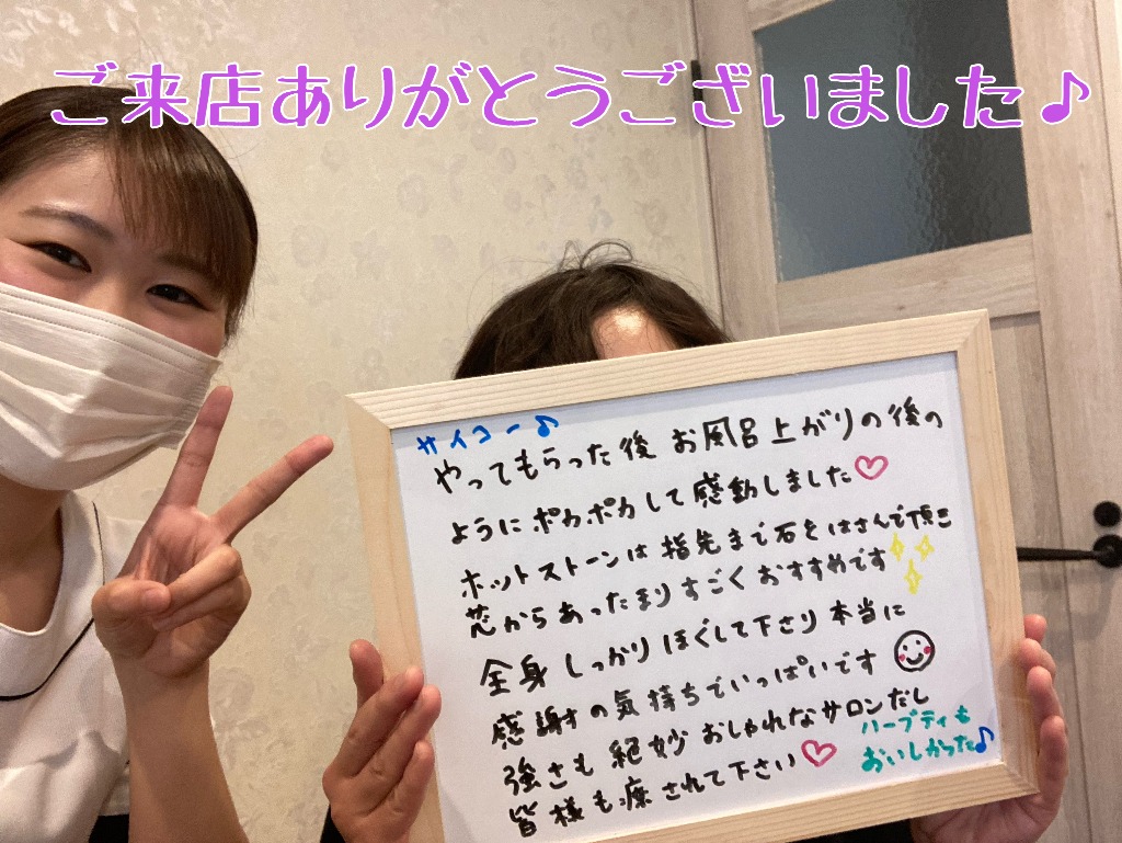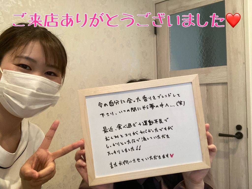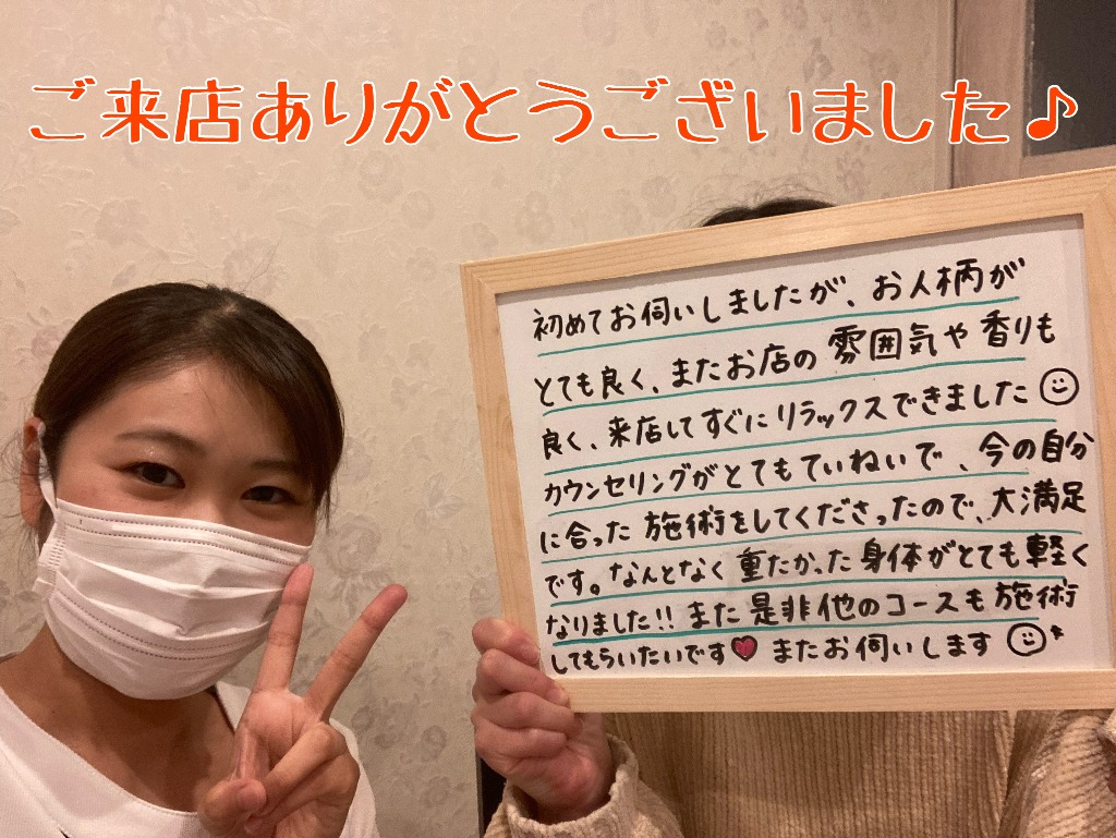 初めてお伺いしましたが、お人柄がとても良く、またお店の雰囲気も香りも良く来店してすぐにリラックスできました。カウンセリングがとても丁寧で、今に自分に合った施術をしてくださったので大満足です。なんとなく重たかった身体がとても軽くなりました!!また是非他のコースを施術してもらいたいです♡またお伺いします☺