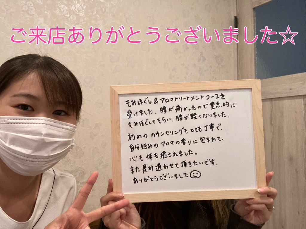 もみほぐし&アロマトリートメントコースを受けました。腰が痛かったので重点的にもみほぐぐしてもらい、腰が軽くなりました。初めのカウンセリングも丁寧で自分好みのアロマの香りに包まれて、心も体も癒されました。また是非通わせていただきたいです。ありがとうございました☺ (30代)